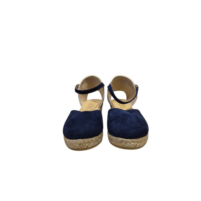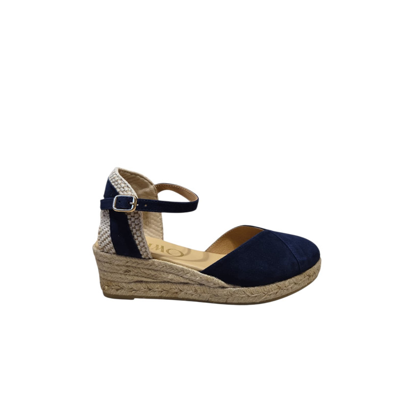 Global es una alpargata de cuña media de diseño cerrado, con cierre de hebilla y una silueta limpia y bien proporcionada, acabada en ante liso.