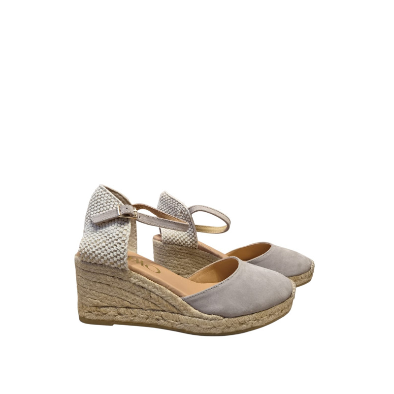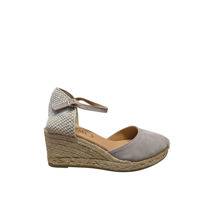 Global es una alpargata de cuña media de diseño cerrado, con cierre de hebilla y una silueta limpia y bien proporcionada, acabada en ante liso.