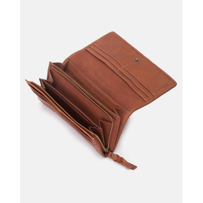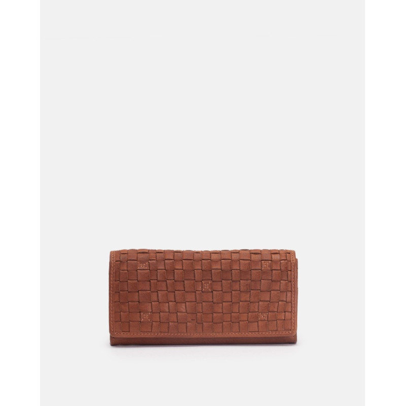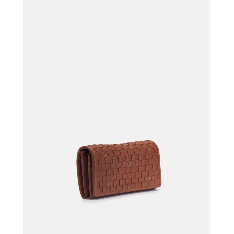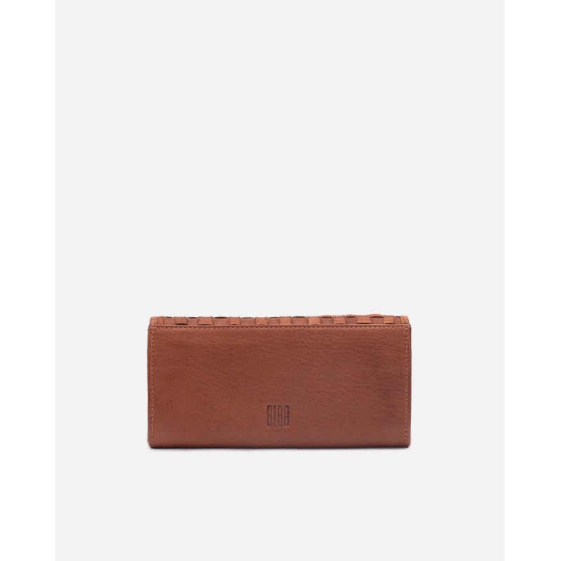 Billetero grande de piel vacuna, lavada, de curtición vegetal, y trenzada a mano. Solapa, cierre con botón, compartientos para tarjetas, billetes y monedas.