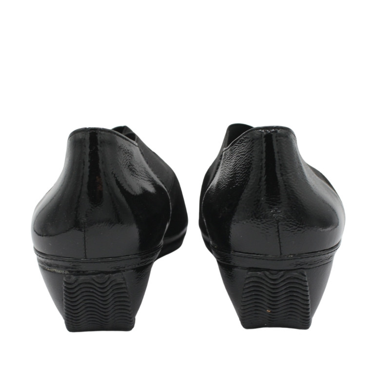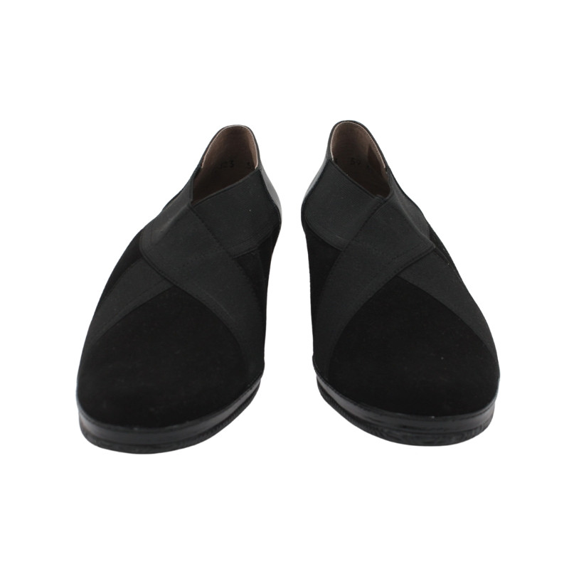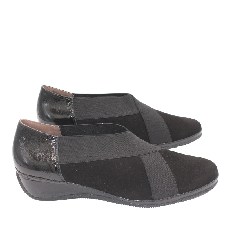 ZAPATO CON GOMAS CRUZADAS ANTE Y CHAROL NEGRO