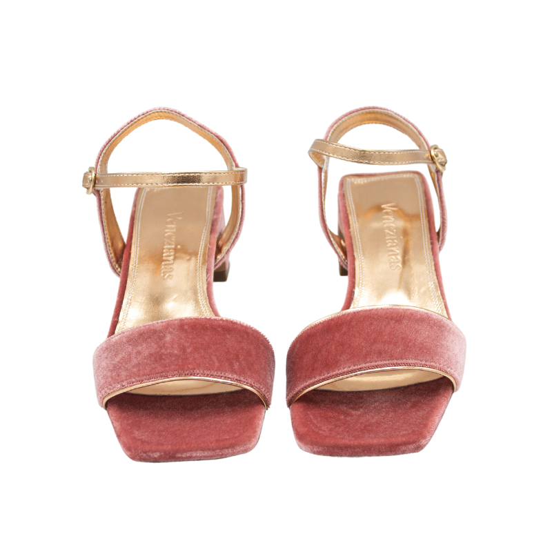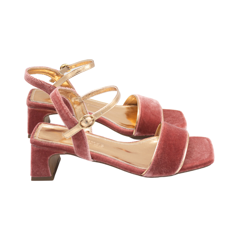 SANDALIA DE TERCIOPELO CON FORRO DE PIEL METALIZADO DORADO. CON PLANTA DE GEL PORQUE LLEVAR TACONES NO TIENE POR QUÉ DOLER.