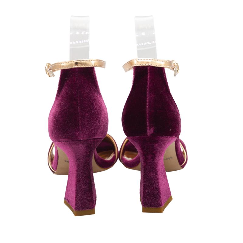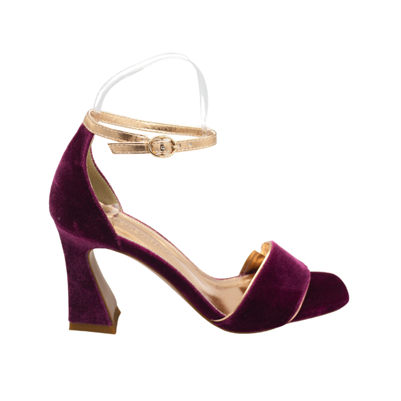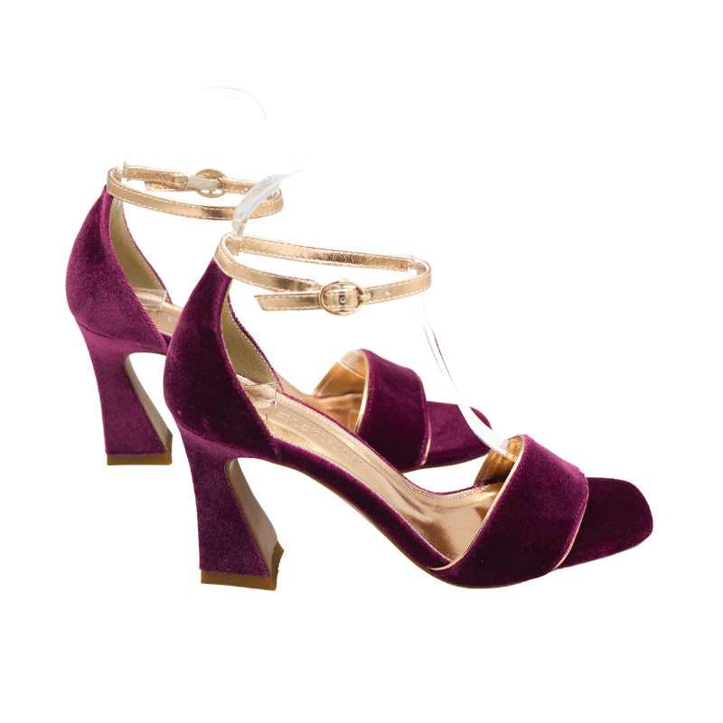 SANDALIA DE TERCIOPELO CON FORRO DE PIEL METALIZADO DORADO. CON PLANTA DE GEL, PORQUE LLEVAR TACONES NO TIENE POR QUÉ DOLER.