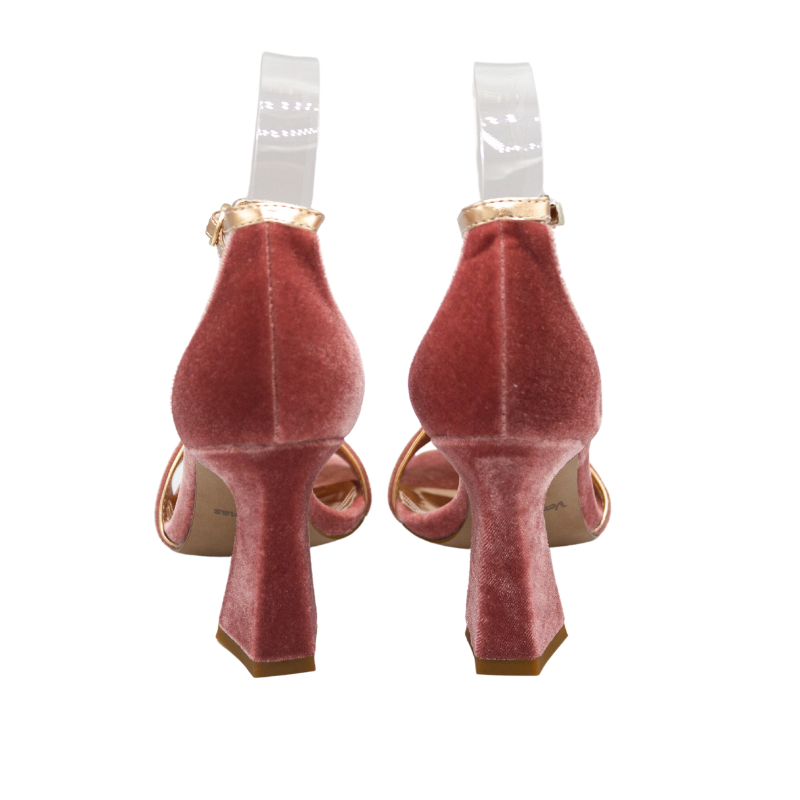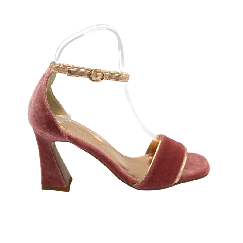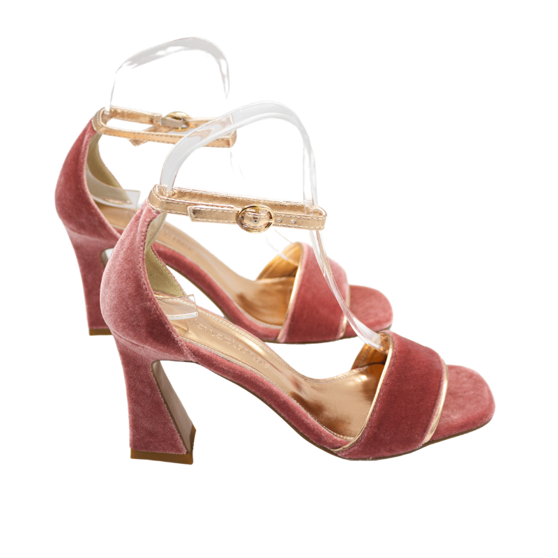 SANDALIA DE TERCIOPELO CON FORRO DE PIEL METALIZADO DORADO. CON PLANTA DE GEL, PORQUE LLEVAR TACONES NO TIENE POR QUÉ DOLER.
